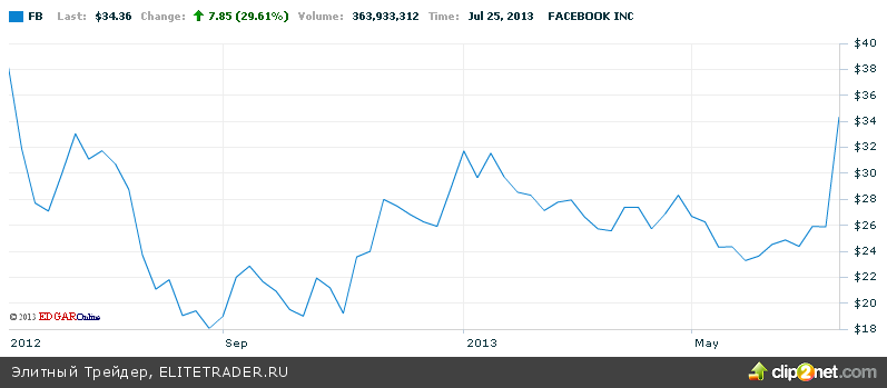 Ну и конечно нельзя не отметить сделанный вклад в рост Nasdaq Composite акций социальной сети Facebook, цена на которые выстрелила почти на 30% также на фоне квартальных финрезультатов обнародованных в среду после закрытия. Полтора десятка брокеров подняли свои оценки акции компании на фоне роста доходов от мобильной рекламы. Вчерашнее сумасшествие в акциях Facebook едва не вывело котировки к цене размещения скандального IPO.