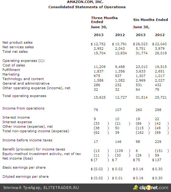 К слову сказать на постмаркете акции Amazon.com просели на 2% после сообщений о полученных чистых убытках по итогам последних трех месяцев в размере 2 центов на акцию, тогда как аналитики ожидали 5-6 центов прибыли на акцию. В то же время выручка компании выросла на 22% до 15,7 млрд. в соответствии с консенсус-прогнозом. Прогноз компании на третий квартал не дотянул до оптимистичных ожиданий Wall Street ($390 млн.), будучи обозначенным в диапазоне от -$100 млн. до $275 млн.