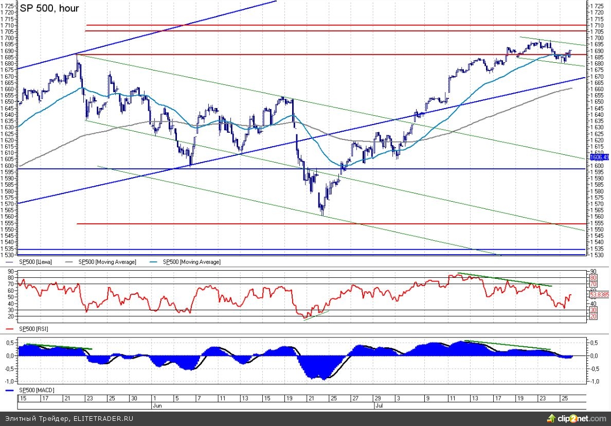 В данный момент фьючерсный контракт на SP500 торгуется с повышением на 0,27% около отметки 1689 п.
