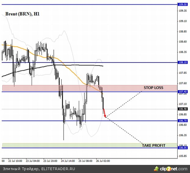 Продаем если цена закроется ниже нижней полосы Боллинджера на часовом графике с целью в области 106,15. Stop-Loss=107,50