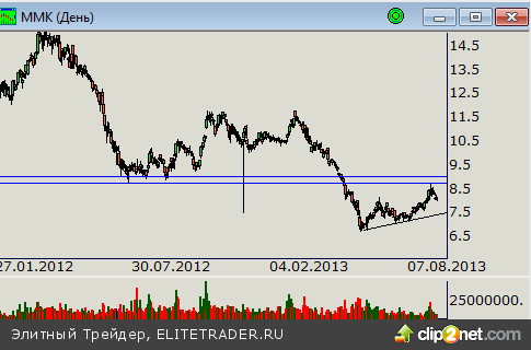 В настоящее время цены откатываются от ранее протестированного на предмет сопротивления уровня в районе отметки 8.50 рублей. Учитывая, что общая тенденция по-прежнему нисходящая, мы вправе рассчитывать на продолжение снижения котировок. Вблизи отметки 7.5 рублей проходит линия спроса локального восходящего тренда. Здесь покупателям будет важно проявить стойкость, иначе ценам будет по силам проверить на прочность минимумы года.