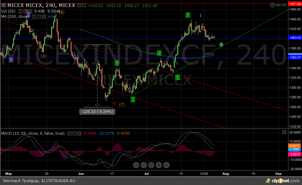 На российском рынке в последние месяцы наблюдается достаточно серьезная волатильность, с отсутствием ярко выраженного тренда. При этом ММВБ уже добрался до первой цели роста на уровне 1440 и теперь демонстрирует незначительную коррекцию. В текущей ситуации предполагается 2 наиболее возможных сценария развития событий о том, как поведет себя российский рынок в ближайшие недели. Оба сценария примерно равновероятны и зависят от предстоящего заседания ФРС.