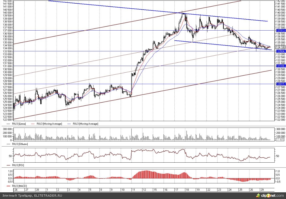 После снижения накануне и тестирования уровня поддержки в районе 133500-134000 пунктов фьючерс на индекс РТС немного замедлил ход. Последние сутки идет консолидация на достигнутых уровнях около линии локальной поддержки с середины июля. Сегодня будут новые попытки организовать от 134000 отскок вверх.