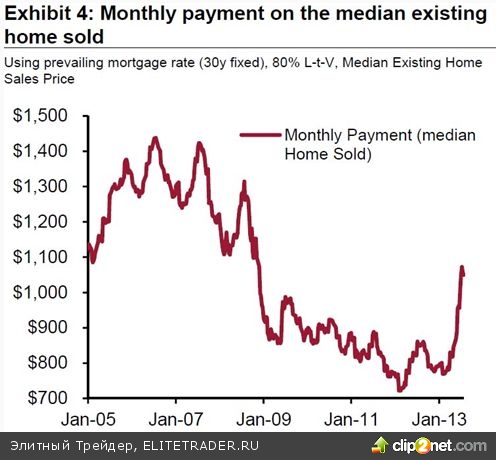Тем временем, Credit Suisse демонстрирует, что заявления о «восстановлении рынка недвижимости США» являются несколько преждевременными. Дело в том, что довольно важным показателем для американцев является размер ежемесячного кредитного взноса за дом. В этом году индикатор вырос на 40% - до $1100, что явно будет негативно влиять на доходы американцев и, соответственно, на покупательскую способность. Zerohedge.com