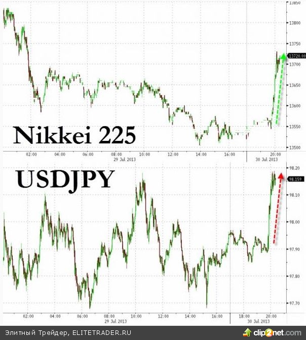 Тем временем, Zerohedge демонстрирует, как отреагировал японский фондовый рынок и иена на слабые данные по промпроизводству: Nikkei 225 вырос на 1.53%, а котировки пары USD/JPY подскочили с 97.90 до 98.159 пунктов.