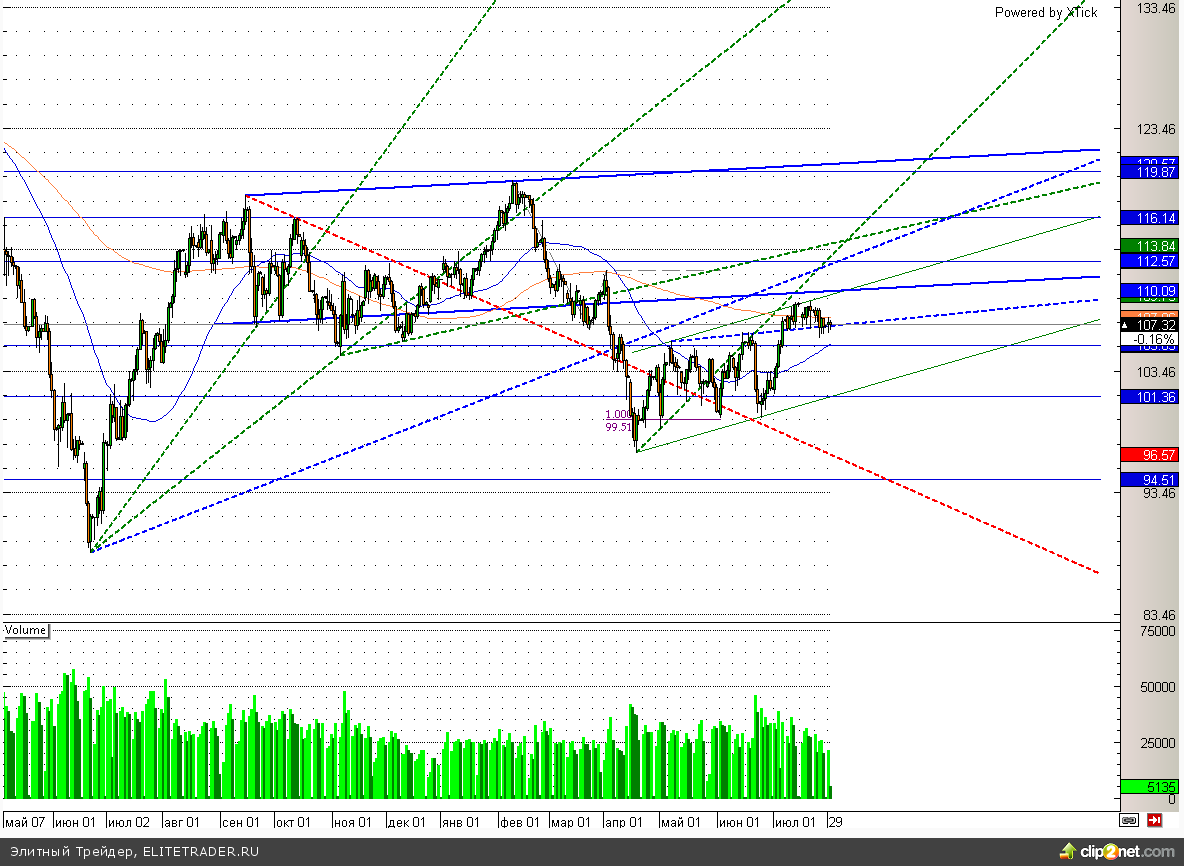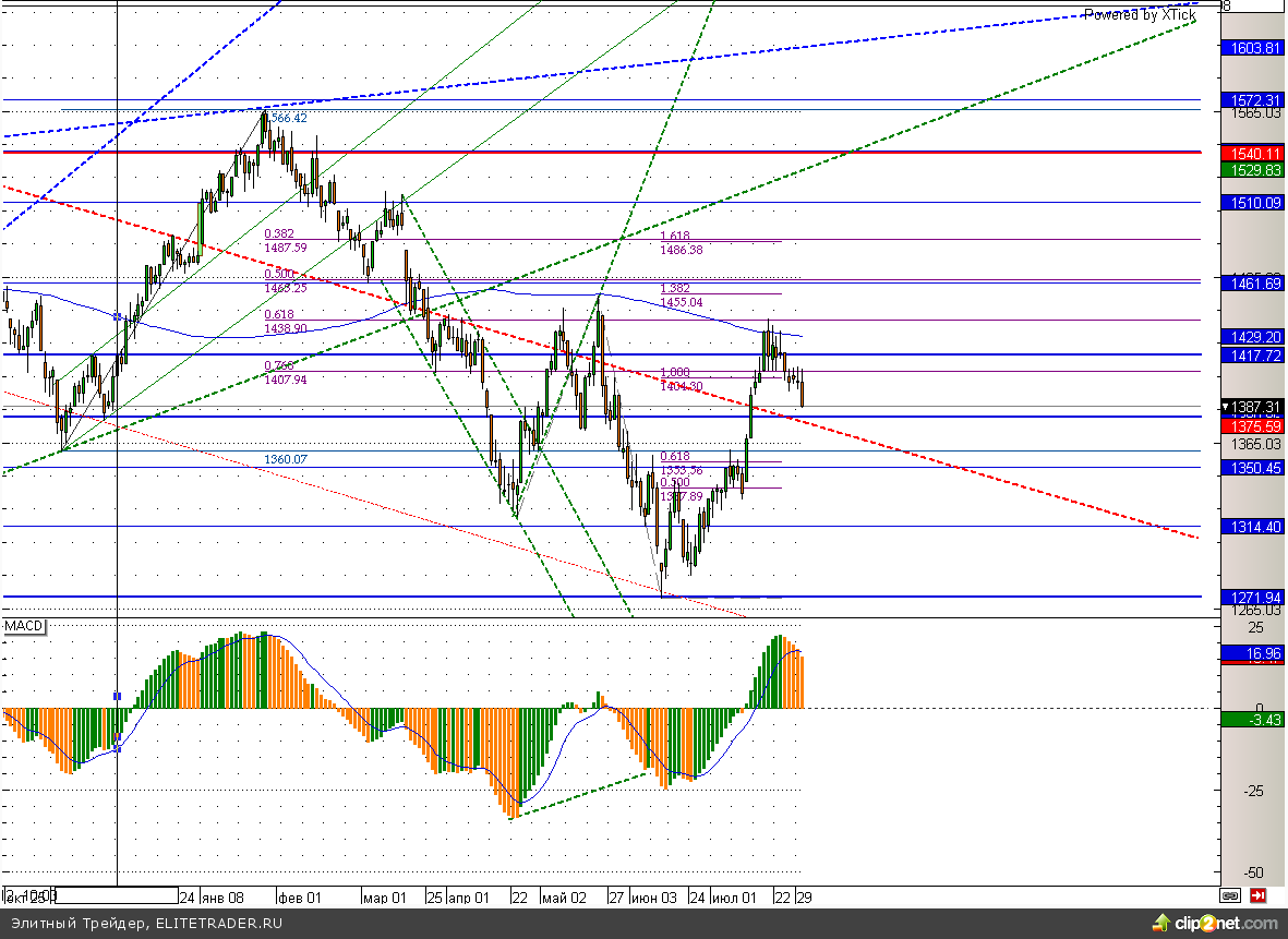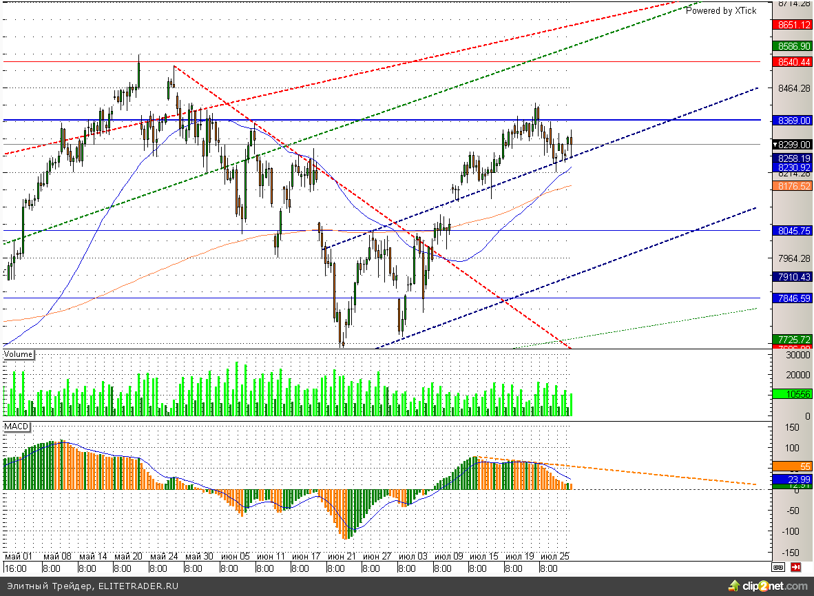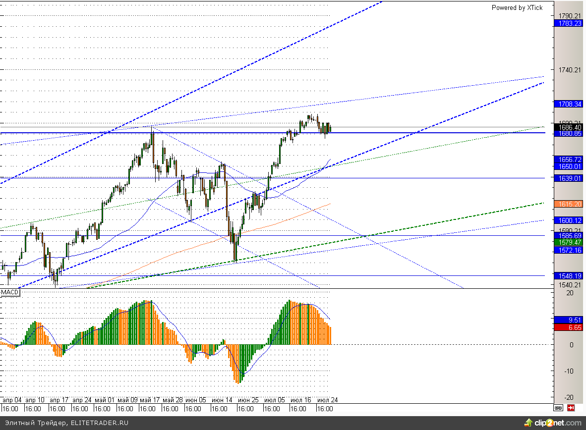 Индекс S&P500 консолидируется вблизи исторических максимумов более 2-х недель. При этом значимое сопротивление расположено на уровне 1710, а поддержка в виде трендовой линии располагается на 1650. Поэтому однозначных сигналов данный инструмент сейчас не дает.