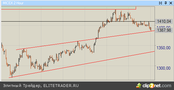 Вернуть отметку 1410 пунктов покупателям так и не удалось. При этом их слабость привела к пробою нижней границы диапазона - отметке 1400 пунктов. Таким образом, коррекция к прошедшему росту набирает обороты. На данный момент диагональная поддержка удерживает индекс от дальнейшего снижения. Ее пробой позволит ценам идти ниже с потенциалом тестирования зоны 1340-1360 пунктов. Если покупатели удержат текущие уровни, то в краткосрочном плане мы будем рассчитывать на консолидацию между уровнями 1410-1385 пунктов.
