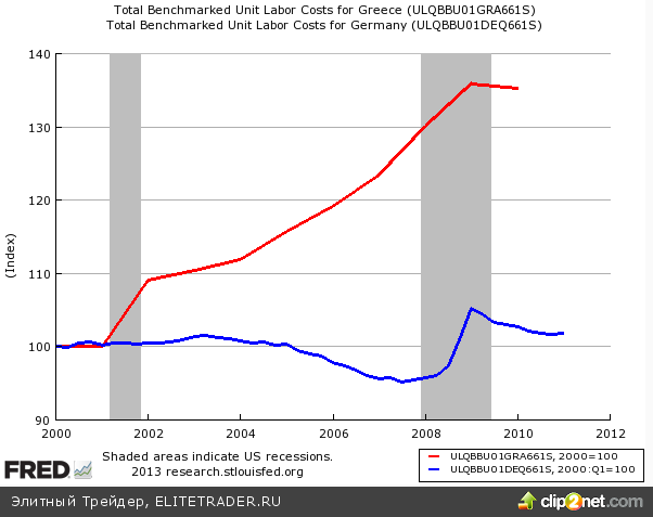 Второй график показывает, что стоимость рабочей силы в Греции резко взлетела с момента вступления страны в еврозону, тогда как в Германии показатель даже немного снизился. Все это делает Грецию абсолютно неконкурентоспособной страной. BusinessInsider