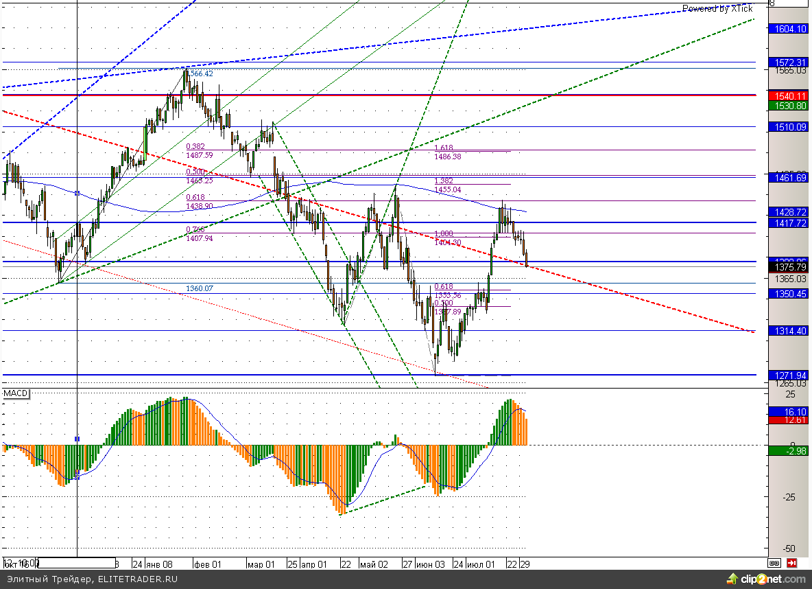 Российский рынок завершил торговую сессию среды на отрицательной территории. Индекс ММВБ потерял 0,83%, на фоне дешевеющей нефти, но ниже 1475 так и не опустился, что сохраняет для «быков» шанс на возобновление роста. При этом, судя по сегодняшним макроэкономическим данным по американской экономике шансы эти очень даже неплохие. ВВП США во втором квартале вопреки ожидаемому росту на 1,1% прибавил целые 1,7%, что крайне позитивно для рынков. В свою очередь ценовой индекс (+0,7%) наоборот вырос сильно меньше ожиданий, что снижает опасения по поводу скорого окончания стимулирующих программ в стране.