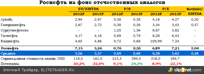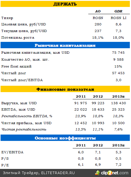 Тем не менее, если Роснефть сосредоточится на эффективности бизнеса, грамотном управлении имевшимися и вновь приобретенными месторождениями, а также не будет и дальше увеличивать долговую нагрузку, то мы не исключаем рост капитализации в среднесрочной перспективе. 3К13 обещает быть более благоприятным на фоне восстановления цен на нефть и слабого, несмотря на это, рубля. К тому же, осенью традиционно растет спрос на энергоносители.
