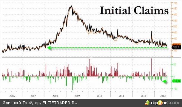 До начала торгов американцы получили еще одно подтверждение восстановления рынка труда – на прошлой неделе число первичных заявок по безработице неожиданно сократилось на 19 тысяч до 326 тысяч, хотя ожидался рост на 2 тысячи. Это самый низкий показатель с января 2008 года.