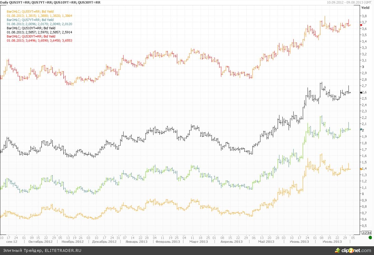 Обнародованный вчера Казначейством США отчет по квартальному рефинансированию указал на то, что в ближайшие месяцы потребность в финансировании сократится, в связи с чем, будут сокращены объемы по двухлетним/трехлетним нотам. Никаких подробностей относительно положения дел с финансированием при достижении пололка госдолга помощник секретаря Казначейства Мэтью Резерфорд не раскрыл, лишь призвав Конгресс решить вопрос после Дня труда - 2 сентября. Наконец, четкие сроки были обозначены по введению в обращение облигаций с плавающей ставкой. Произойдет это в январе 2014 года. Конкретные параметры январского аукциона будут определены в ноябре. На рынке американского госдолга вчера зафиксирован был небольшой рост, хотя в моменте наблюдался заметный подъем доходностей