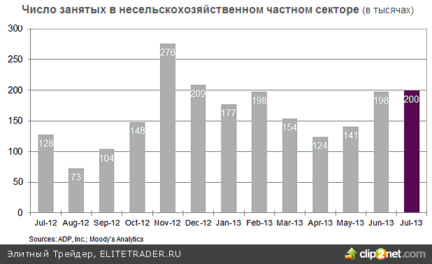 Обнародованный вчера отчет ADP о занятости в частном секторе указал на рост созданных рабочих мест в июле на 200 тыс., превысив ожидаемые 180 тыс. Июньское значение было пересмотрено в сторону увеличения со 188 до 198 тыс. Высокая корреляция этого показателя с официальными цифрами по Non-Farm Payrolls, ожидаемыми в пятницу, указывает на то, что в плане рынка труда, по всей видимости, у ФРС не будет препятствий для сокращения стимулирования в сентябре.