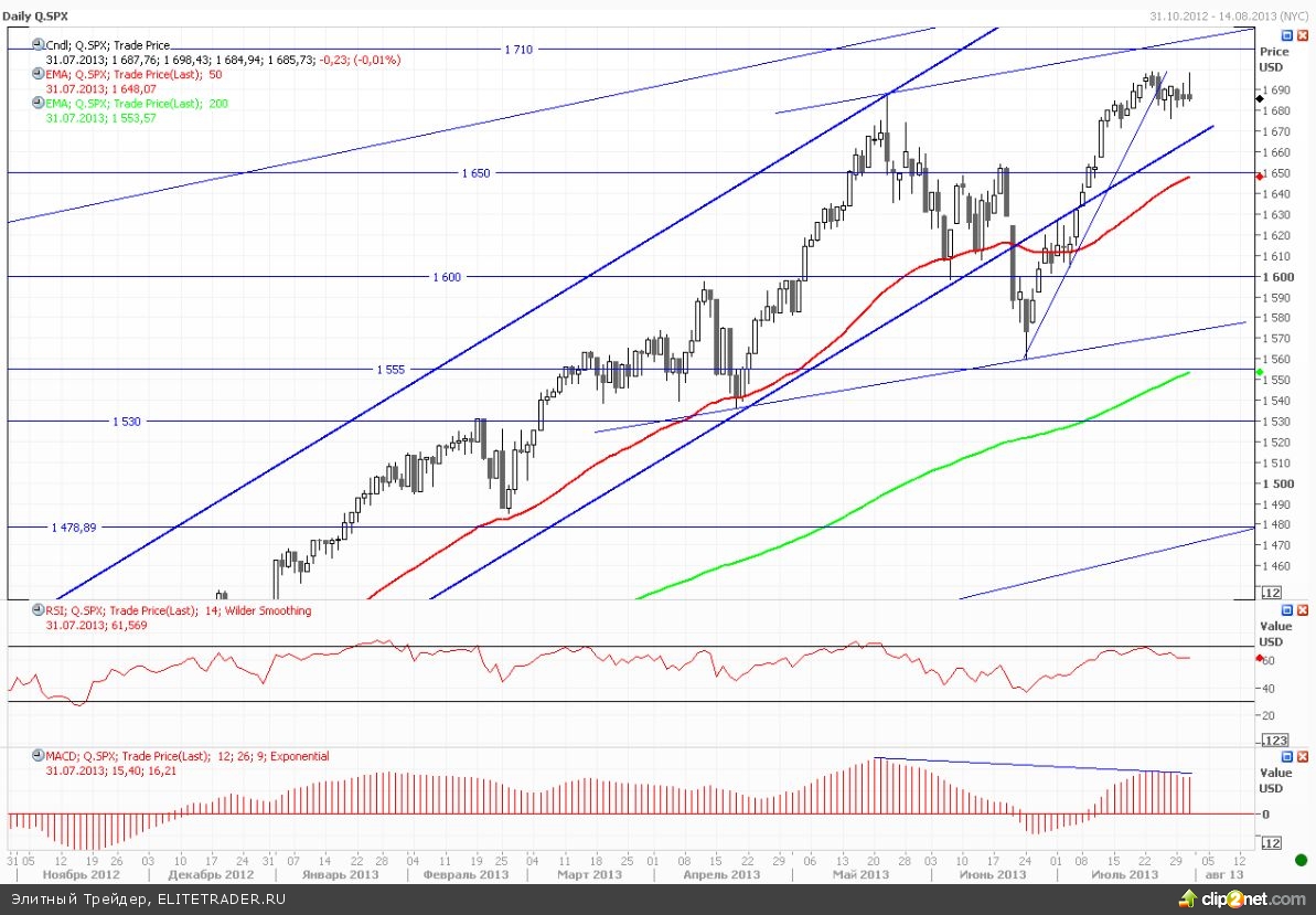 Начало на рынке акций США характеризуется торгами в «зеленой» зоне. Прежде всего, инвесторы должны быть рады тому, что вчера Бен Бернанке не стал намекать на скорейшее уменьшение объемов покупок бондов в рамках QE3, однако драйверов роста из других стран хватает и сегодня. В результате индекс S&P 500 впервые превысил отметку 1700 пунктов.