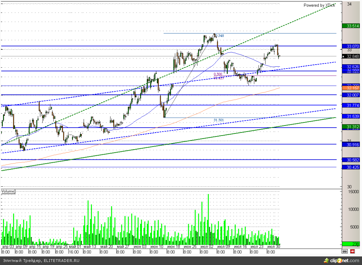 Рубль растет к доллару на 5 копеек. Российскую валюту сегодня поддерживают высокие цены на нефть. По сорту Brent рост составляет более 0,3% и котировки вновь приблизились к уровню 110 долларов за баррель. Между тем интервенции Банка России также продолжают оказывать поддержку рублю, но уже в несколько меньшей степени, чем это было к концу прошлой недели. После повышения до 7,57 млрд рублей в среду и 8,12 млрд рублей в четверг, к пятнице продажа иностранной валюты ЦБ РФ вновь вернулась к своему среднемесячному значению и составила 6,6 млрд рублей. В свою очередь основным риском для рубля сейчас является снижение ставки рефинансирования на заседании 9 августа. Учитывая постепенно снижающуюся инфляцию, а также недозагрузку производственных мощностей, смягчение денежно-кредитной политики Банком России сейчас очень вероятно. Поэтому использовать текущий момент для покупок российской валюты достаточно рискованно и лучше дождаться более благоприятного момента для входа в позицию.