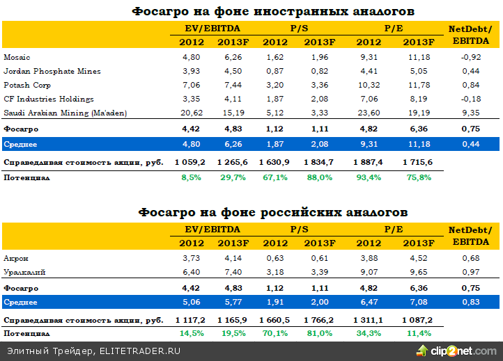 Сравнительный анализ показывает, что Фосагро по рыночным мультипликаторам смотрится дешевле зарубежных аналогов, что можно объяснить менее крупными размерами бизнеса. Относительно российских аналогов Фосагро, на наш взгляд, оценен справедливо: он торгуется дешевле Уралкалия, но дороже Акрона. Уралкалий – мировой лидер в калийной отрасли и гораздо крупнее Фосагро, однако работает только на рынке калийных удобрений. Что же касается Акрона, то это более близкий к Фосагро аналог (также производитель сложных удобрений), и хотя они примерно сопоставимы по масштабам бизнеса, Акрон имеет не такие высокие показатели рентабельности (рентабельность по EBITDA составила 28% на конец 2012 года, у Фосагро – 33%) и более высокую долговую нагрузку. Поэтому более высокие величины рыночных мультипликаторов Фосагро мы считаем оправданными.