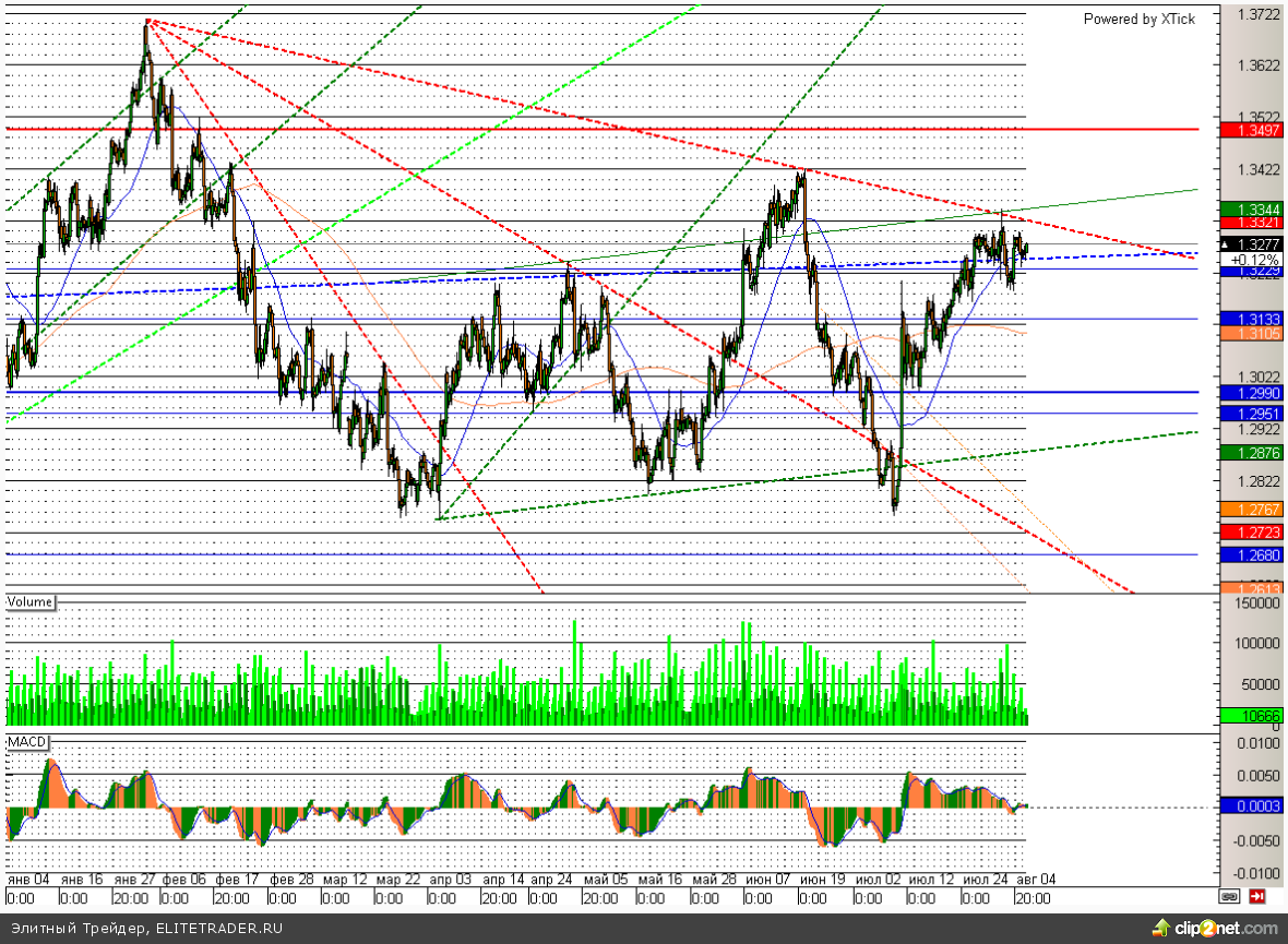 Евро прибавляет к доллару 0,1%. Европейская валюта продолжает торговаться вблизи важного сопротивления на уровне 1,335. На данной отметке проходит краткосрочная трендовая линия, и ее пробой ускорит движение вверх в район 1,35. Основным драйвером для роста пары евро/доллар вполне могут стать хорошие данные по экономике региона, которые в текущий момент все больше радуют участников торгов. В частности индекс деловой активности в сфере услуг за июль показал рост в район 49,8 при средних ожиданиях на уровне 49,6.