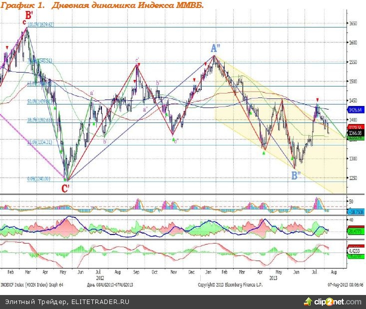 Индекс ММВБ – преодолел верхнюю границу нисходящего тренда, корректируется. MACD сформировал сигнал вниз. ADX указывает на прекращение восходящего тренда, DMI+ и DMI- сошлись, ADX в средней части шкалы и направлен вниз. Индикатор, основанный на динамике ADX, 18 июля сформировал сигнал вниз.