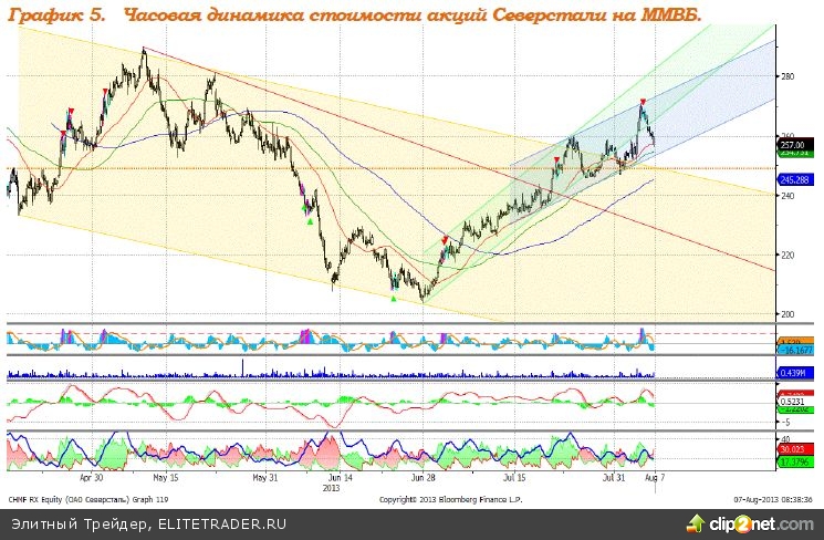 Северсталь – формирует восходящий тренд. MACD сформировал сигнал вниз. ADX указывает на отсутствие тренда. Индикатор, основанный на динамике ADX, 5 августа дал сигнал к снижению. Поддержка: 254,0. Сопротивление: 277,0. Рекомендация: Покупать.