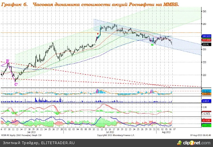 Роснефть – преодолела нижнюю границу восходящего тренда. MACD сформировал сигнал вниз. ADX указывает на наличие нисходящего тренда. Индикатор, основанный на динамике ADX, 30 и 31 июля сформировал сигнал к росту. Поддержка – 230,00. Сопротивление – 238,50. Рекомендация: Вне рынка.