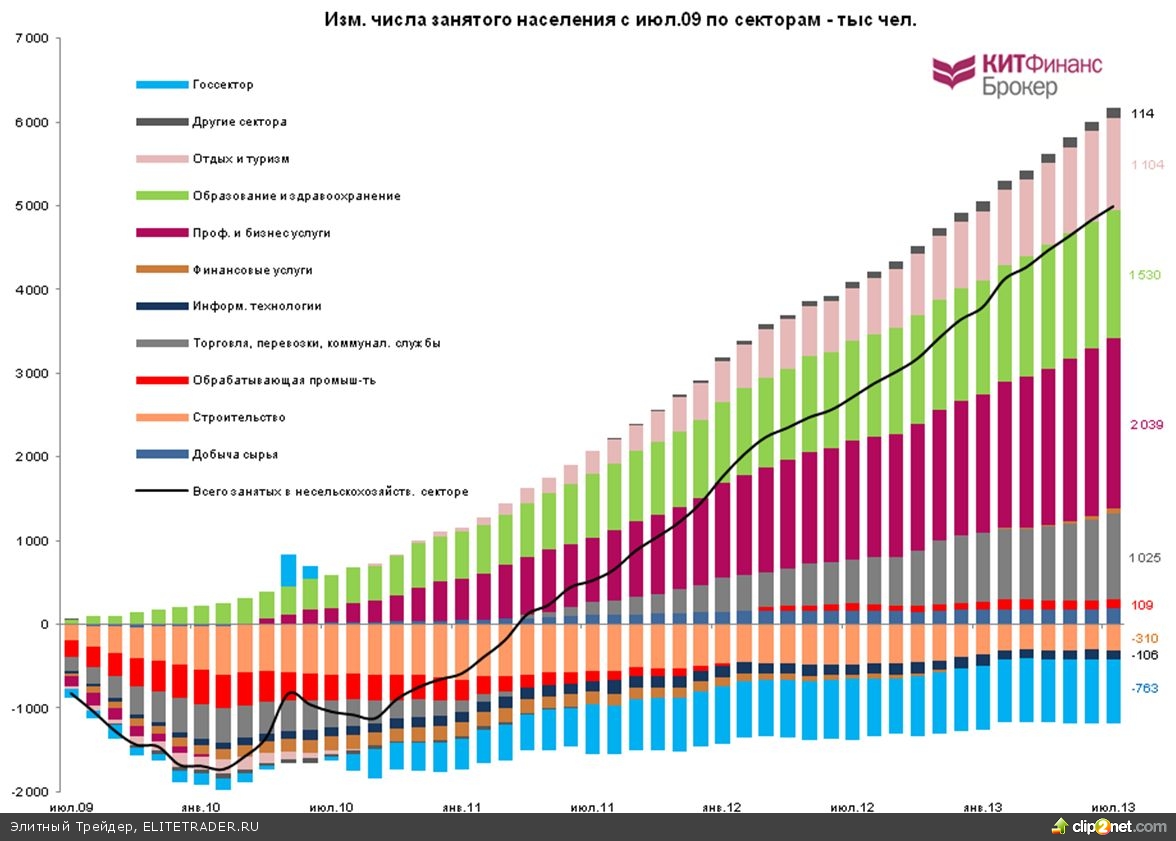 Создание рабочих мест в июле 2013 года составляет лишь половину от того, что было в феврале (332 тыс чел.), а число занятых на неполный рабочий день по экономическим причинам выросло на 19 тыс до 8,245 тыс чел. – это максимум июня 2012 года. От общего числа работающих неполный рабочий день это составляет 30%.