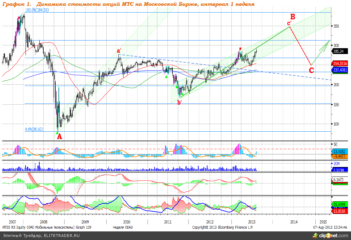 В течение последних 1,5 лет динамика котировок акций МТС выглядит значительно лучше динамики российских индексов акций. Полагаем, цены на бумаги компании формируют восходящую волну c’ в волне B, которая также направлена вверх. При этом котировки акций МТС находятся в рамках восходящего канала, который мы выделили на графике светло-зеленым цветом. Исходя из традиционного равенства волн a’ и c’, а также из глубины коррекционного снижения в рамках волны b -’, можно предположить, что целью волны c’, а вместе с ней и волны B является уровень 345,00–350,00 рубля за акцию. Индикаторы: MACD на недельном графике в настоящее время сформировал сигнал к росту. Индикатор повышения DMI+ находится выше индикатора снижения DMI- (индикаторы постепенно расходятся), индикатор силы тренда ADX расположен в средней части шкалы и направлен вверх, что говорит о развитии восходящего тренда, который продолжает набирать силу. Индикатор, основанный на динамике ADX, в марте текущего года дал сигнал к снижению, который уже отработан.