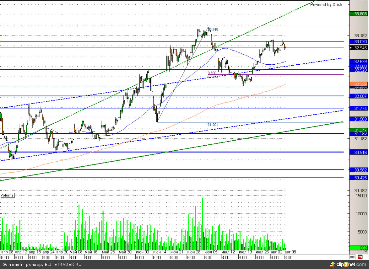 Рубль прибавляет к доллару 7 копеек. Российскую валюту сегодня поддерживает рост нефтяных котировок, а также интервенции Банка России в размере 6,58 млрд рублей. Между тем уже завтра состоится заседание ЦБ РФ. Снижение ставки рефинансирования на данном заседании имеет очень большую вероятность, из-за падающей инфляции и недозагруженных мощностей. Данное событие в свою очередь может впоследствии негативно сказаться на движении российской валюты. Таким образом, у рубля сейчас существуют сильные риски для продолжения снижения, в связи, с чем вероятность ухода выше 33 сейчас значительно выше, чем возвращение в район 32,5.