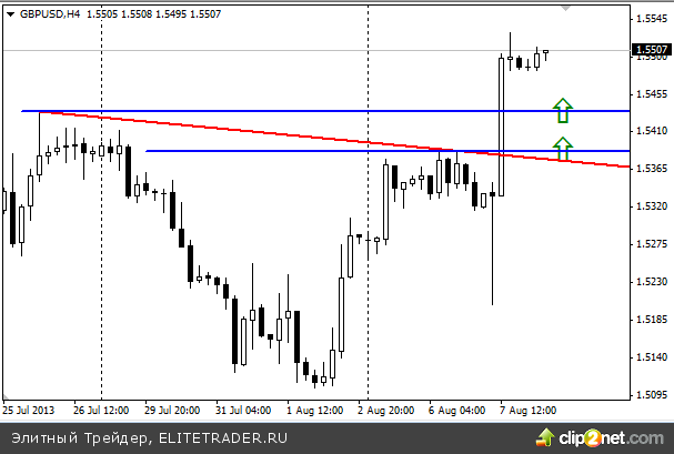 Британский фунт вчера, после позитивных данных об объемах промышленного производства пробил сопротивление и вышел из зоны консолидации. На текущий момент курс уже достаточно высок для новых покупок, поэтому лучшим сценарием будут покупки GBP после коррекции к пробитым сопротивлениям 1,5430 и 1,5380. Целью роста на ближайшие дни станет отметка 1,5660, уровень сопротивления от 19 июня 2013.