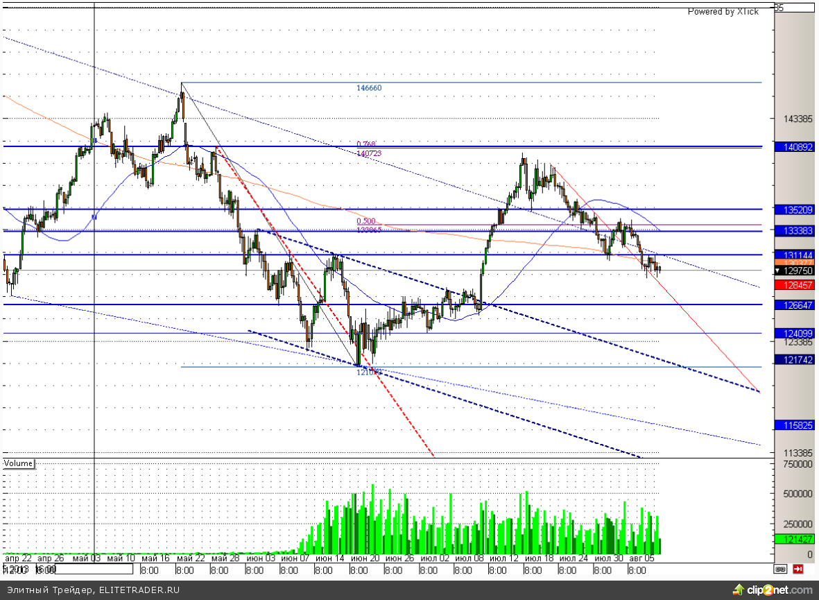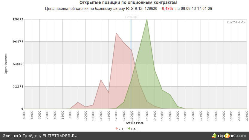Между тем открытые опционные позиции по RIU3 со сроком исполнения 15.08.13 также смотрят на покупку. На отметке 130000 можно увидеть огромное количество опционов пут, которые выступают как очень сильная поддержка. При этом максимальное количество опционов колл расположилось лишь вблизи уровня 140000.