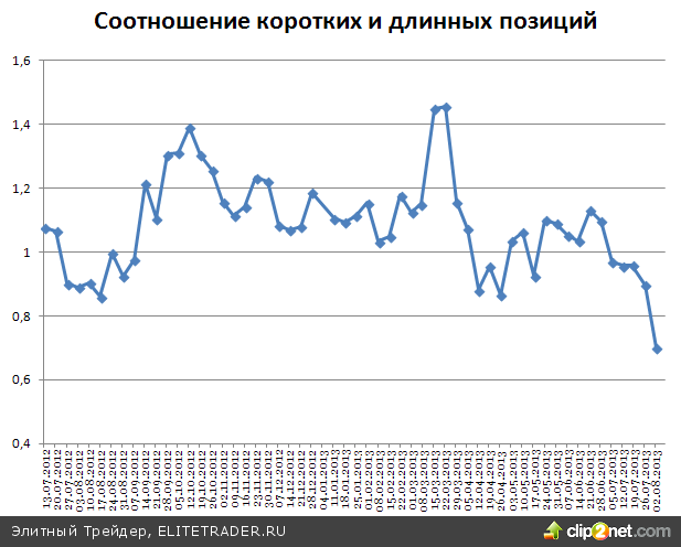 Обратив внимание на открытые юридическими лицами позиции по фьючерсу на индекс, можно заметить, что настроения крупных игроков с конца прошлой недели стали еще более «бычьими». Соотношение коротких и длинных позиций теперь составляет 0,699 против 0,896 тремя днями ранее.