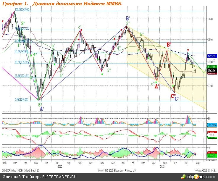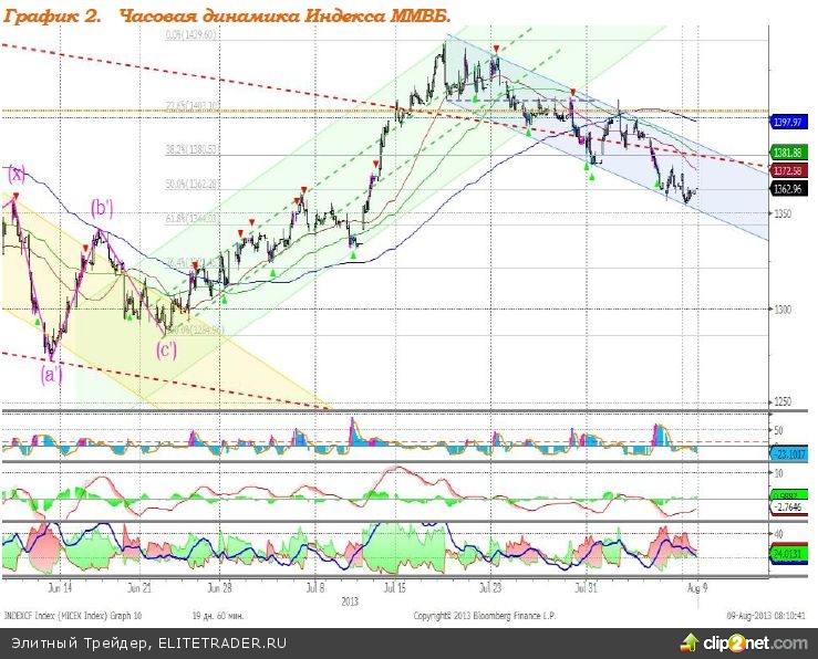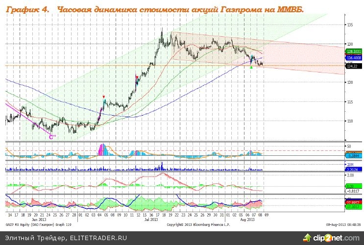 Индекс ММВБ - преодолел верхнюю границу нисходящего тренда (красная пунктирная линия), которую тестирует в настоящее время в качестве уровня поддержки. MACD сформировал сигнал вверх. DMI+ и DMI- практически сошлись, ADX в средней части шкалы и направлен вниз, что говорит об отсутствии локального тренда. Индикатор, основанный на динамике ADX, в начале августа сформировал множество сигналов к росту. Рекомендация: Покупать