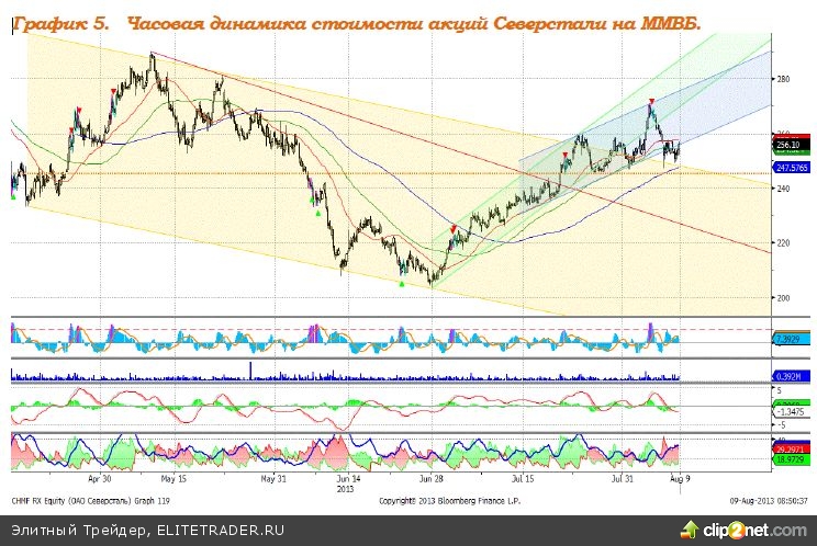 Северсталь – формирует восходящий тренд. MACD формирует сигнал вверх. ADX указывает на наличие локального нисходящего тренда. Индикатор, основанный на динамике ADX, 5 августа дал сигнал к снижению. Поддержка: 252,5. Сопротивление: 277,0. Рекомендация: Покупать