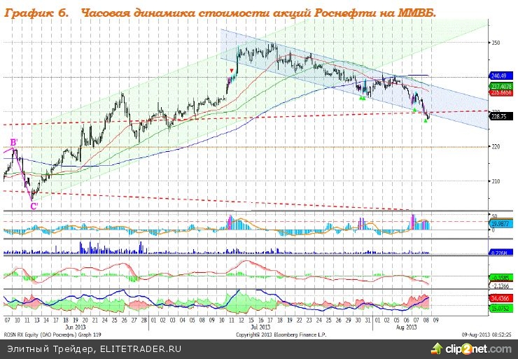 Роснефть – преодолела нижнюю границу восходящего тренда, корректируется. MACD сформировал сигнал вниз. ADX указывает на наличие нисходящего тренда. Индикатор, основанный на динамике ADX, 30 и 31 июля, а также 6 и 7 августа сформировал сигналы к росту. Поддержка – 227,00. Сопротивление – 238,00. Рекомендация: Вне рынка