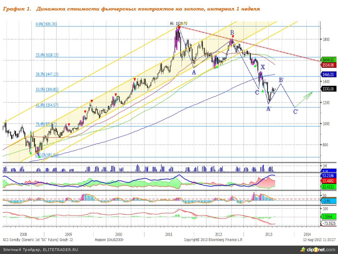 Полагаем, в августе котировки золота покажут умеренный рост и будут находиться в диапазоне значений $1275–1365 за тройскую унцию. В целом дальнейшую динамику цен на драгоценный металл будут определять развитие ситуации в мировой экономике и действия монетарных властей ведущих экономик мира.