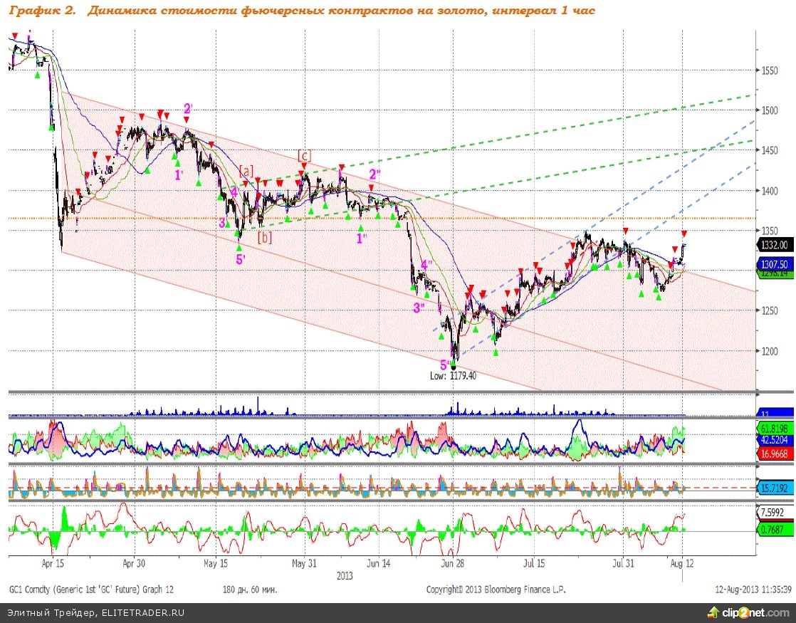 Цены на золото смогли оторваться от верхней границы нисходящего канала, который обозначен на графике 2 красным цветам, обозначив, таким образом, возможность к росту. Ожидаем движения котировок вверх к отметке $1360–1370 за тройскую унцию. Однако над рынком продолжает довлеть риск сворачивания QE3, что будет сдерживать рост стоимости драгоценного металла. Индикаторы: MACD на часовом графике в настоящее время сформировал сигнал вверх
