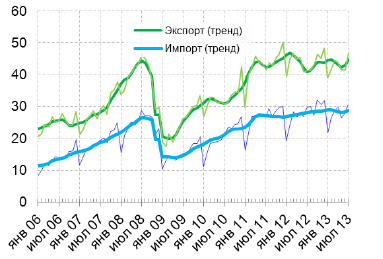 Аналитики "Центра развития" оценивают объем экспорта в июле на уровне $46 млрд против $42 млрд в июне, стоимость импорта увеличилась до $31 млрд с $28 млрд в июне.