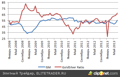 Gold/silver ratio продолжает стремительно падать: после достижения в конце июля максимальной отметки, превышающей 67, коэффициент к середине августа опустился ниже 62. Основная причина этого заключается в том, что серебро — это промышленный металл, который должен извлечь выгоду из восстановления американской и мировой экономики. Я же в очередной раз подчеркиваю высокую корреляцию gold/silver ratio с индексом менеджеров по закупкам от ISM.