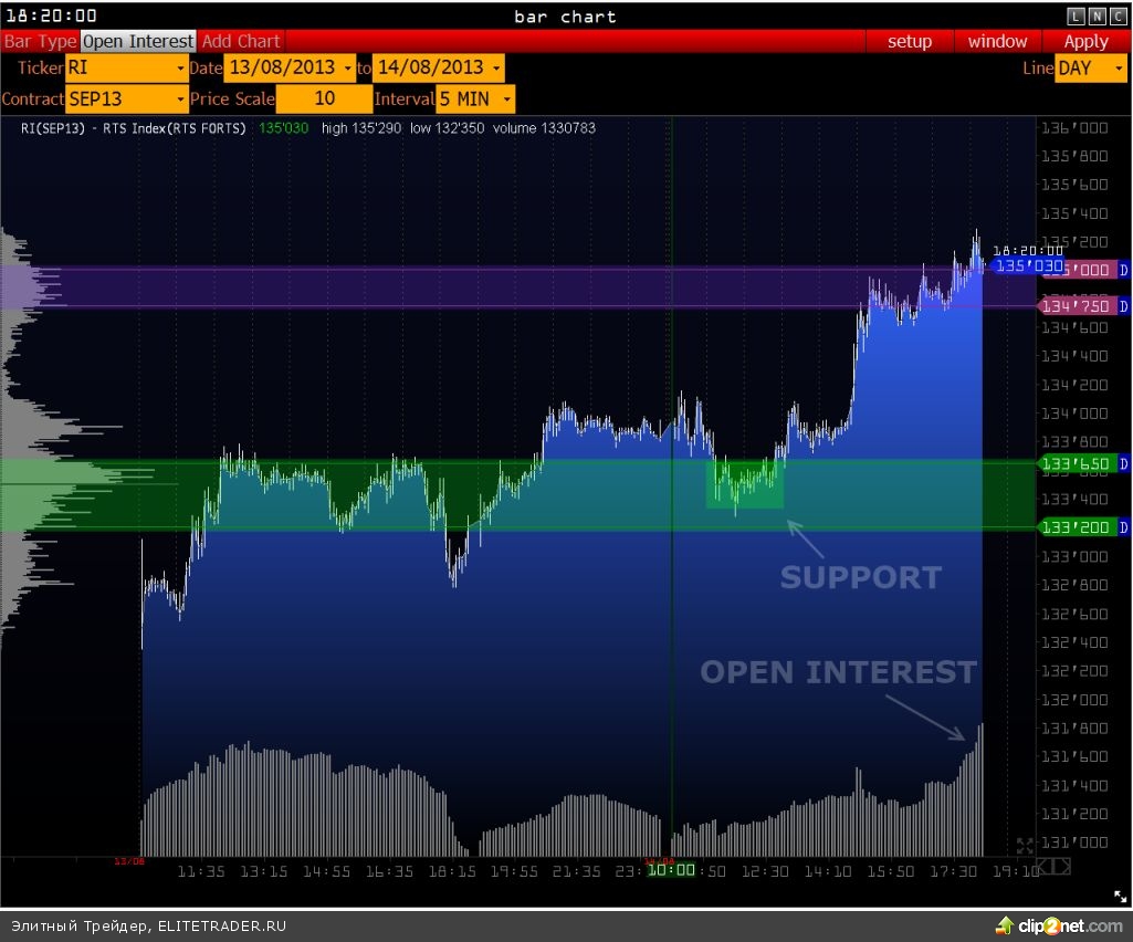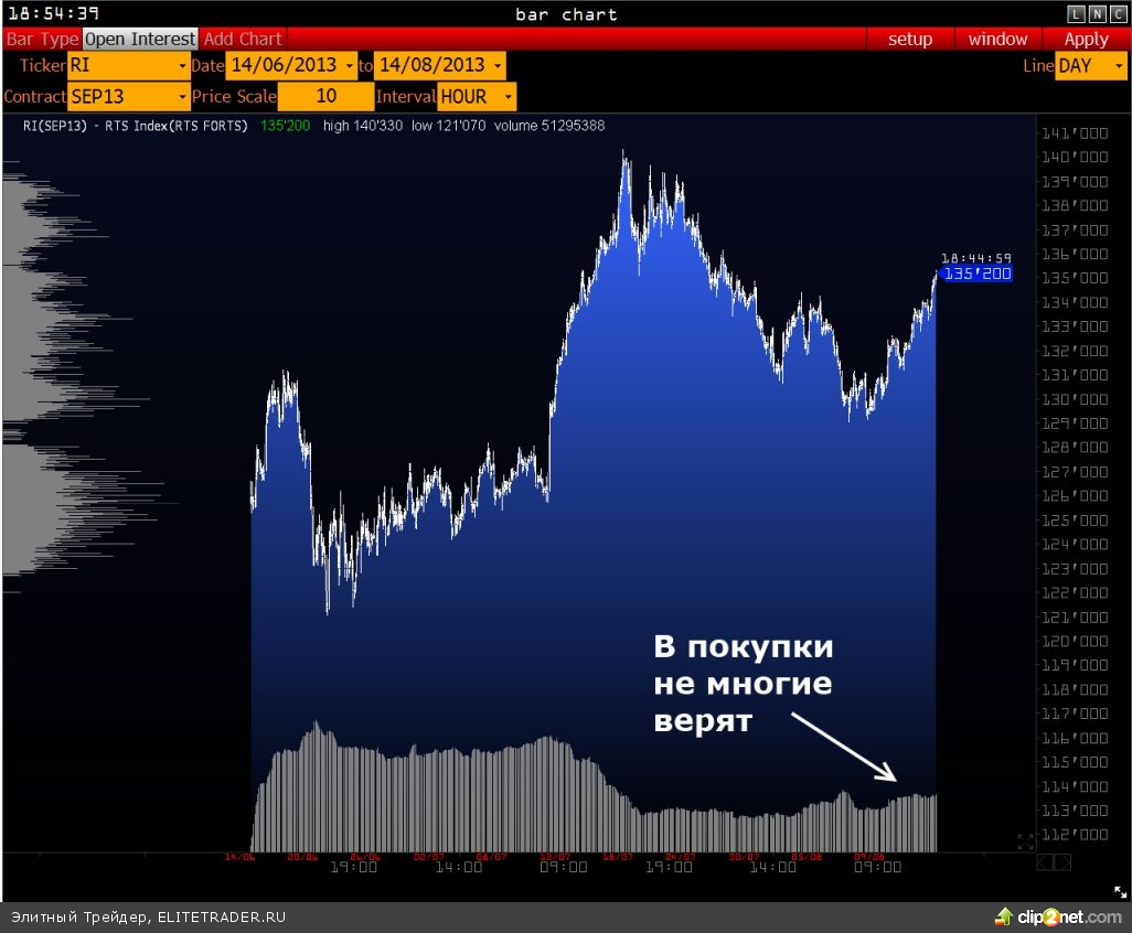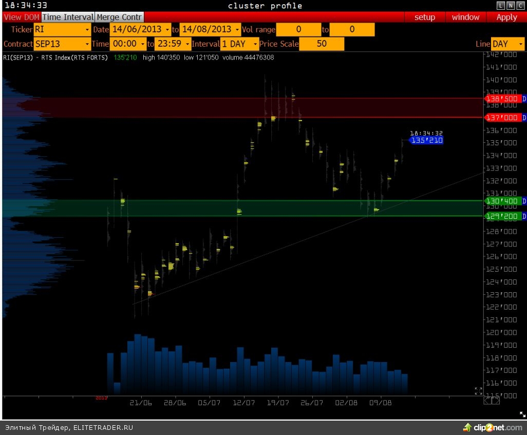 Дождавшись поддержки со стороны баеров цену расширили до 135-ой. Интерес проявляли стабильно, но мало, больше присматривались. Скорее всего из-за того, что нефти сегодня было не по пути с индексом и многие ждали коррекции но не дождались ее.