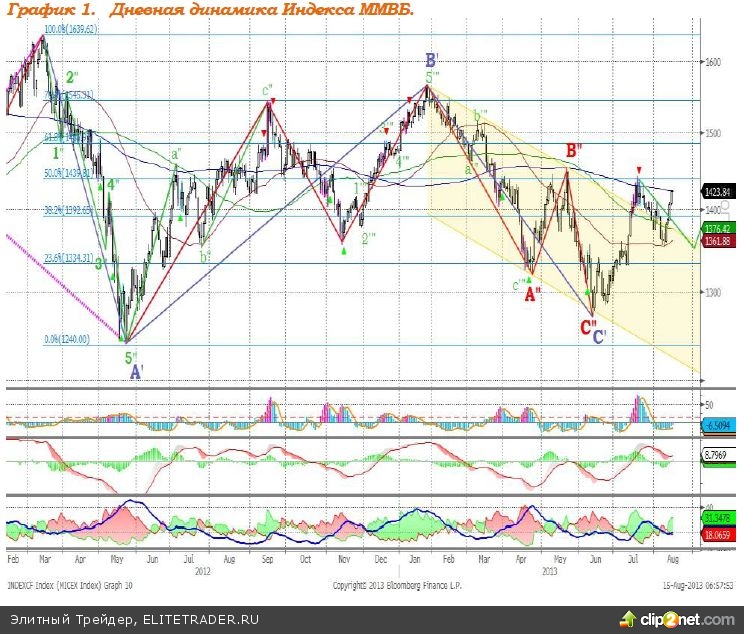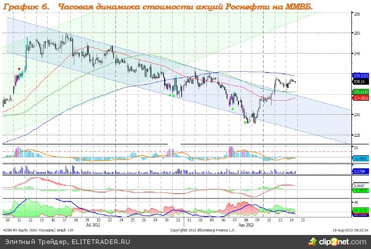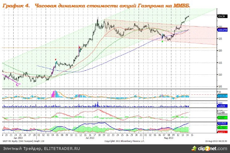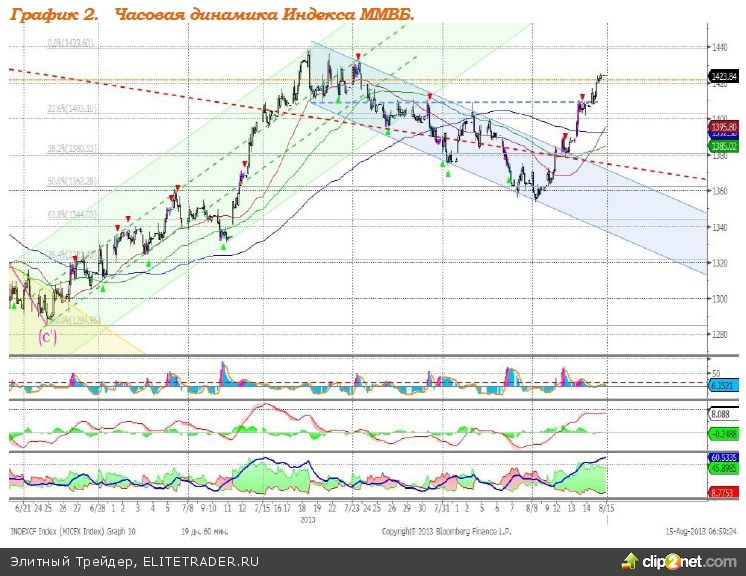 Индекс ММВБ – вышел из нисходящего канала, сопротивление на уровне 1440 пунктов. MACD выглядит нейтрально. DMI+ находится выше DMI-, ADX в верхней части шкалы, что говорит о наличии сильного локального восходящего тренда. Индикатор, основанный на динамике ADX, 13 августа сформировал сигнал к снижению. Рекомендация: Покупать