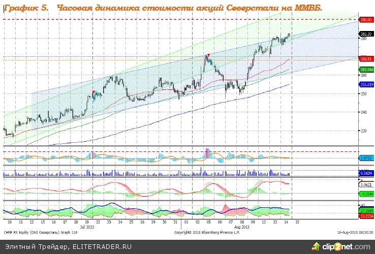 Северсталь – формирует восходящий тренд, возможна коррекция внутри восходящего канала. MACD выглядит нейтрально. ADX указывает на наличие восходящего локального тренда. Индикатор, основанный на динамике ADX, 5 августа дал сигнал к снижению. Поддержка: 263,00. Сопротивление: 290,0. Рекомендация: Держать