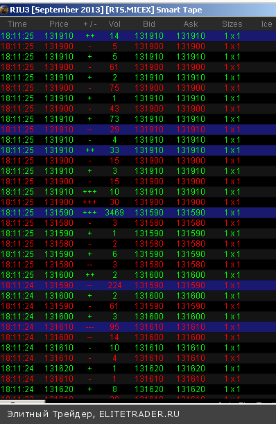 Мы видим здесь 2 сделки. Одна, рыночная, собрали все ордера в стакане с минимума дня 131 590 до 131 900 пунктов (3469 контрактов):