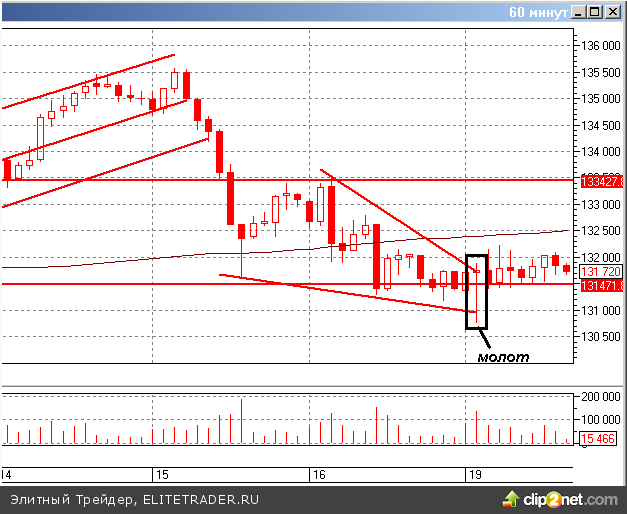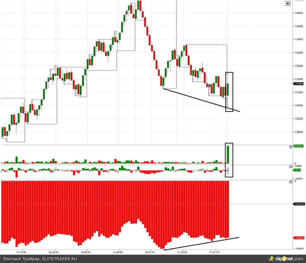 На вершине этого спайка весьма значительный объем в каждом кластере — более 500 контрактов, доходит до 2000 контрактов. Потом дельта сразу пошла отрицательная. И таких спайков в течение дня было весьма много, сбился со счету. Поэтому хочется сделать важный вывод из данного момента, что выход из диапазона 131 500 — 132 000 пунктов будет вниз. Однако здесь есть явный сдерживающий фактор — утренний импульс от 131 000 пунктов. На графике цены на часовике он выглядит как «молот»: