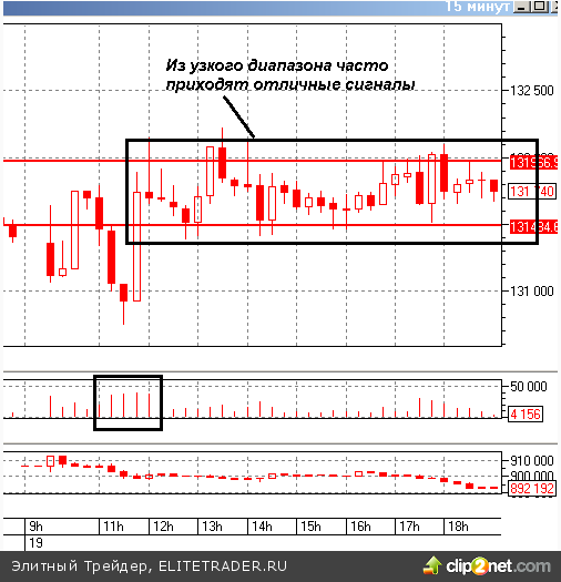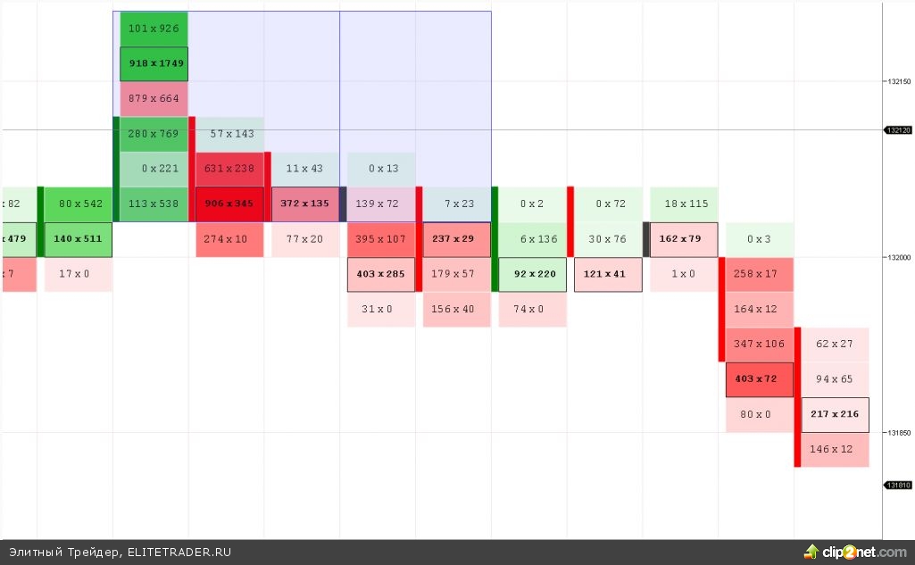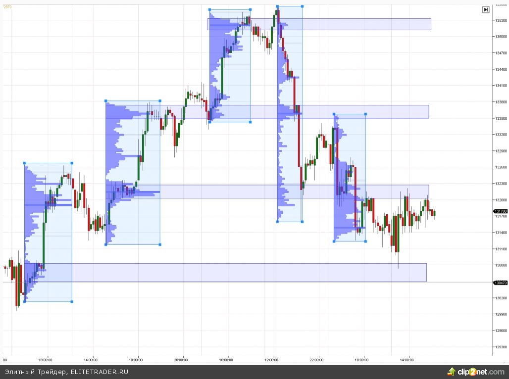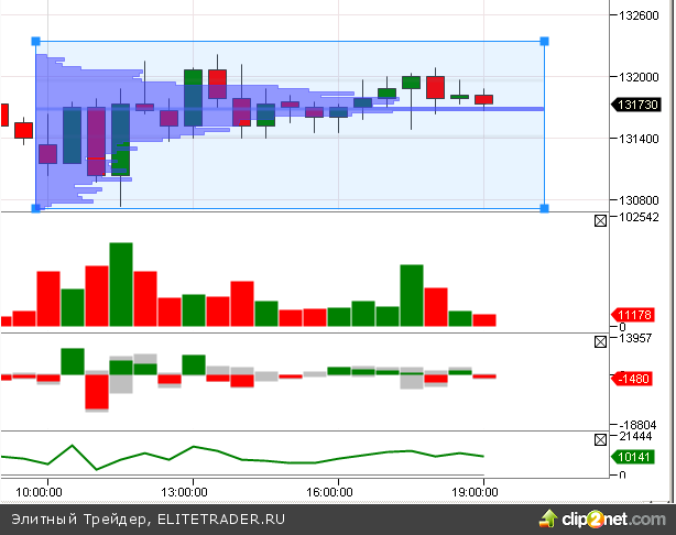 Асы профиля знают, что такой день торгуется на хвостах в сторону возврата к максимальному объему дня. Цена сегодня словно магнит притягивалась к зоне максимальных объемов. Отклонялась вниз на несколько сотен пунктов и потом опять притягивалась, отклонялась вверх к 132 000 пунктам и снова возвращалась. Пока ряд трейдеров безуспешно работали на пробой диапазона меньшая часть успешно сдерживала выход за пределы диапазона.