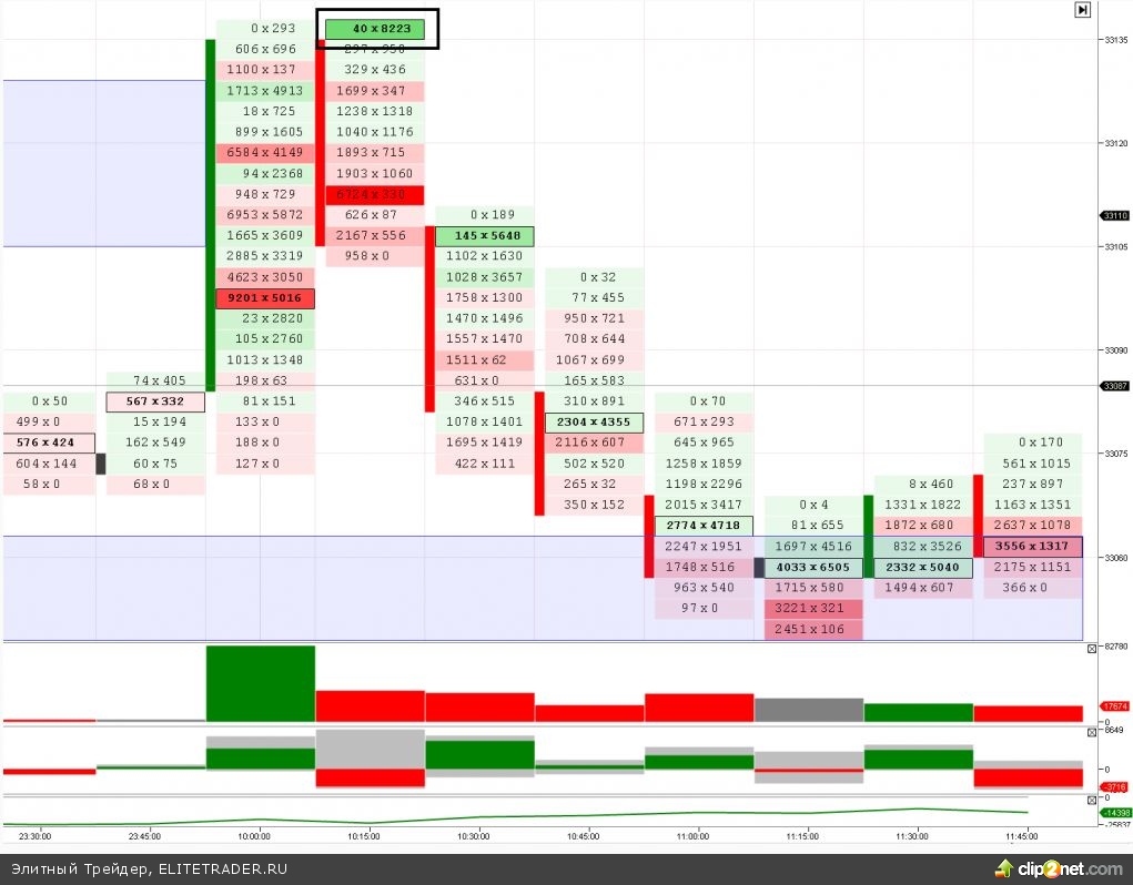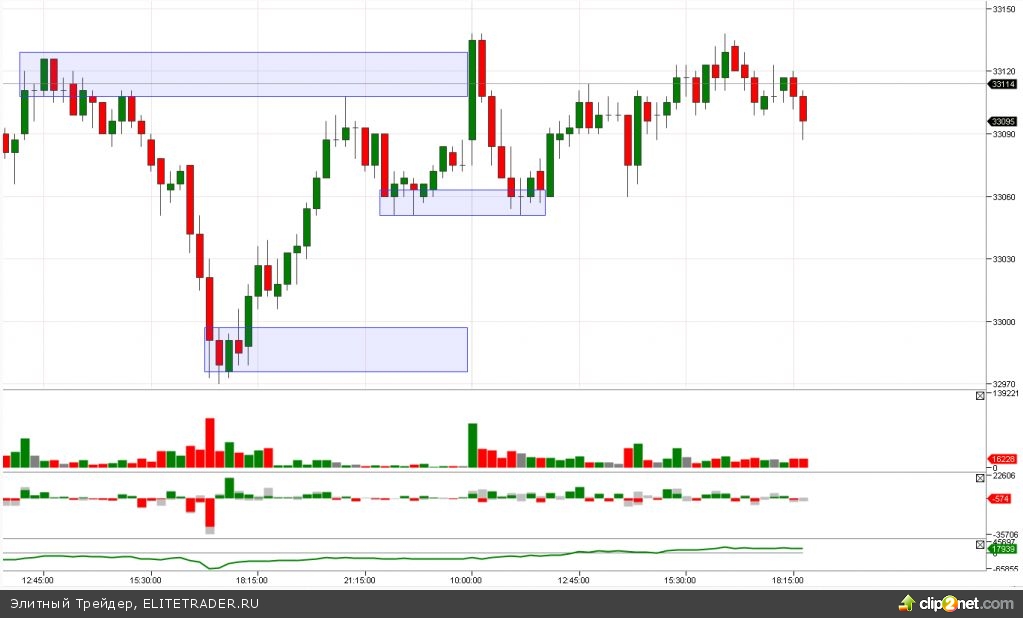 В завершение обзора моя любимая картинка. Здесь с помощью профиля на импульсах вверх и импульсах вниз выделены объемные зоны, которые сейчас выступают зонами поддержки и сопротивления (зоны рисовались до открытия сессии). Сегодня красивых импульсов внутри дня не было (обеденный был совсем коротким) поэтому добавлять новый профиль сегодня на данную картинку я не стал: