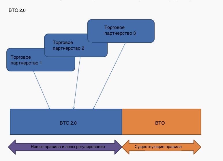На основе крупнейших торговых партнерств будет создано ВТО 2.0 - это будет новая организация, которая будет управлять международной торговлей в XXI века так же, как ВТО управляла ей в XX веке.