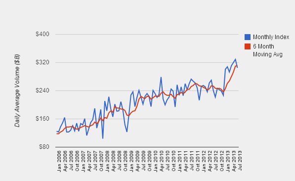Снижение индекса не являлось неожиданностью, так как объем торгов на рынке форекс (равно как и на фондовых рынках и рынках облигаций) обычно значительно падает в северном полушарии во время сезона отпусков в июле и августе. Снижение на 7.5% является относительно умеренным, учитывая бурный рост объема торгов в первом полугодии 2013 года. Кульминационным месяцем стал июнь, когда LeapRate Retail FX Volume Index достиг рекордного максимума 329 млрд. долларов.