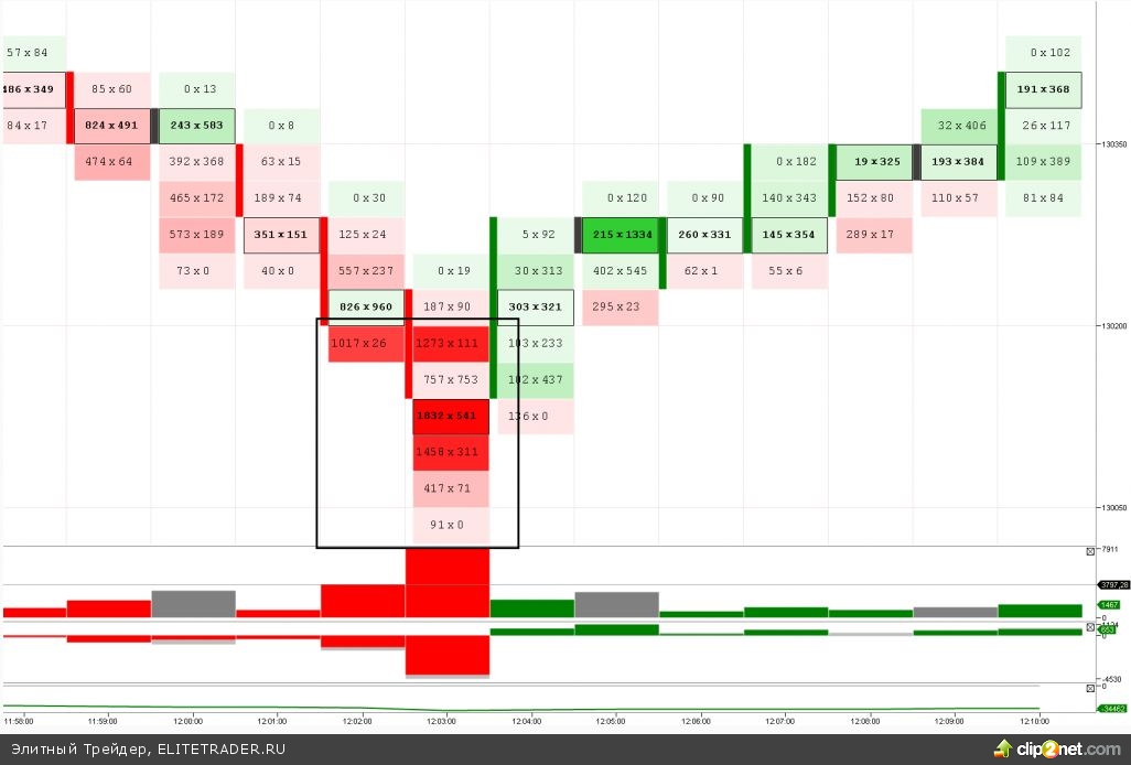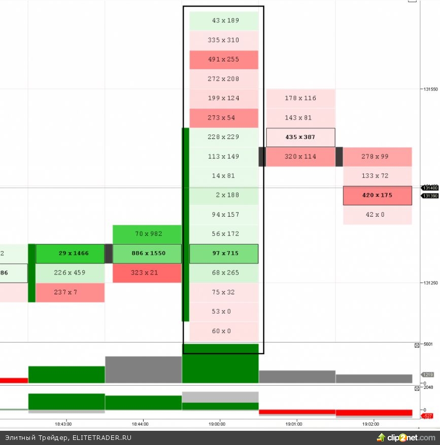 Данный спайк мне важен для набора статистики минутных спайков. Ведь именно на них начинаются серьезные развороты (хочется стать гуру и по минутному графику определять серьезные направления =). Из сегодняшнего спайка (шаг кластера 30пунктов) видно, что в 4 соседних клетках принимали по биду более 1000 контрактов. Ну и самое главное отличие спайка — цена сюда больше не вернулась. Ибо бывают внутридневные спайки (просто отскок небольшой). Да и по объему на спайке мы не всегда поймем моментум покупателя. Ведь мог идти набор объема и на пробой 130 000 пунктов. Поэтому надо понимать, что спайки — это очень коварная вещь. Особенно, на минутных графиках. Поэтому важны объемные спайки именно на важных поддержках.