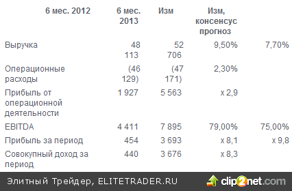Согласно отчету, EBITDA за 6 месяцев 2013 года выросла на 79,0% по сравнению с показателем за 6 месяцев 2012 года и составила 7 млрд 895 млн рублей