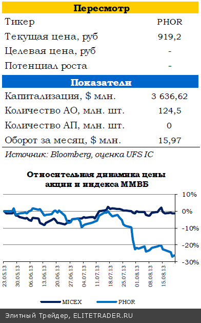 Также сегодня «Фосагро» представит финансовые результаты первого полугодия. Снижение цен на некоторые виды азотных и фосфорных удобрений, а также сезонное снижение продаж окажут давление на финансовые результаты группы во втором квартале. Согласно нашим расчетам, выручка группы во втором квартале может снизиться на 20,2% с $950 млн в 1К13 до $758,5 млн, по итогам полугодия выручка достигнет $1708,5 млн. (+4,0% г/г). В рублевом выражении выручка в квартальном выражении может снизиться на 16,9% до 24,015 млрд рублей (52,917 млрд рублей в 1П13, или +5,1% г/г). Однако негативные ожидания по отчетности уже учтены в котировках.