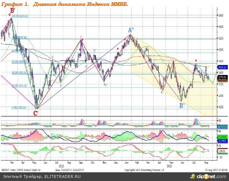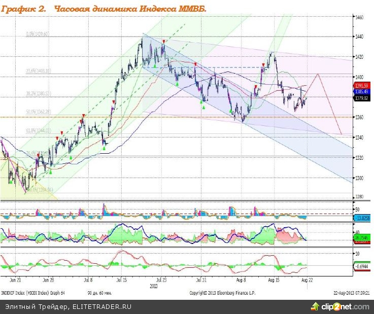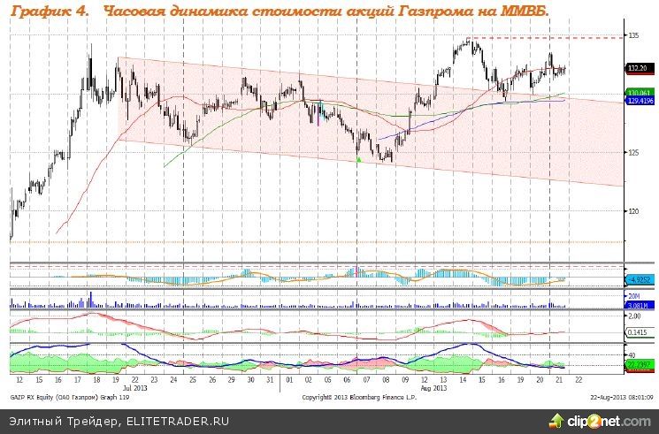 Индекс ММВБ – коррекционное снижение. MACD сформировал сигнал вверх. DMI+ и DMI- сошлись, ADX в нижней части шкалы и направлен вниз, что говорит о прекращении локального нисходящего тренда. Индикатор, основанный на динамике ADX, 13 августа сформировал сигнал к снижению. Рекомендация: Вне рынка